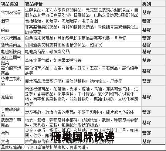 6.2 托寄物被列为危险物品,或者雁巢集运认为不能安全地或合法地承运的物品,包括但不限于涉及动物及其部分、货币、不记名票据、可流转票据、伪冒货品、违反目的国知识产权相关法律的货品、贵重金属和宝石、枪械及其组件、弹药、人体残肢、色情物品,非法毒品/药物等;